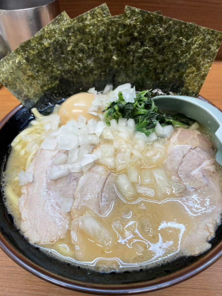 薄めにスライスされた柔らかくて甘いチャーシュー、ほうれん草、煮卵、海苔がトッピングされております。そして先ずは卓上にある生玉ねぎをどぼっと投入、ねっとりコクのあるスープと生玉ねぎの刺激が混ざり合い最高のハーモニーを奏でます。このまま具と麺を少しずつ一緒にすすっていきますがもう序盤のうちに卓上のニンニクをスプーン2杯スープに投入するのが私のスタイル。ニンニクをスープに溶かし込み生玉ねぎと一緒にスープをすするともう悪魔的な美味さとしか表現できないパラダイスが待っています!!この悪魔的スープを皆さんにも楽しんでいただきたいのでお店には当店来店後にお立ち寄りいただくことをお勧めいたします(^^♪